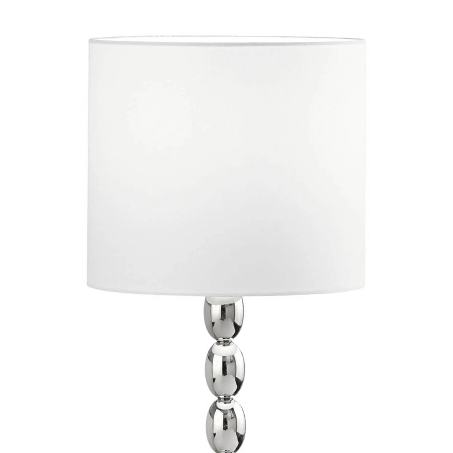 - Lámpara de mesa con base metálica cromada y pantalla de tela.