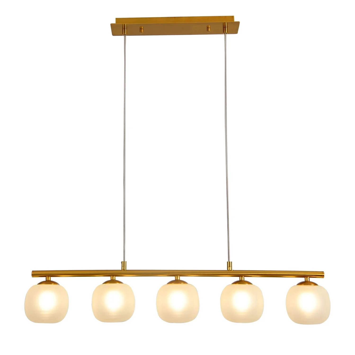 La estructura es de hierro dorado y sus tulipas son de cristal blanco opal, la Lámpara De Techo 5 Luces Hierro Dorado/Blanco Opal Nicoletta ofrece una iluminación cálida y elegante para tu salón o comedor. Funciona con cinco bombillas G9 de hasta 10W cada una (bombillas no incluidas) y su altura regulable te permite adaptarla fácilmente a tus necesidades y preferencias.