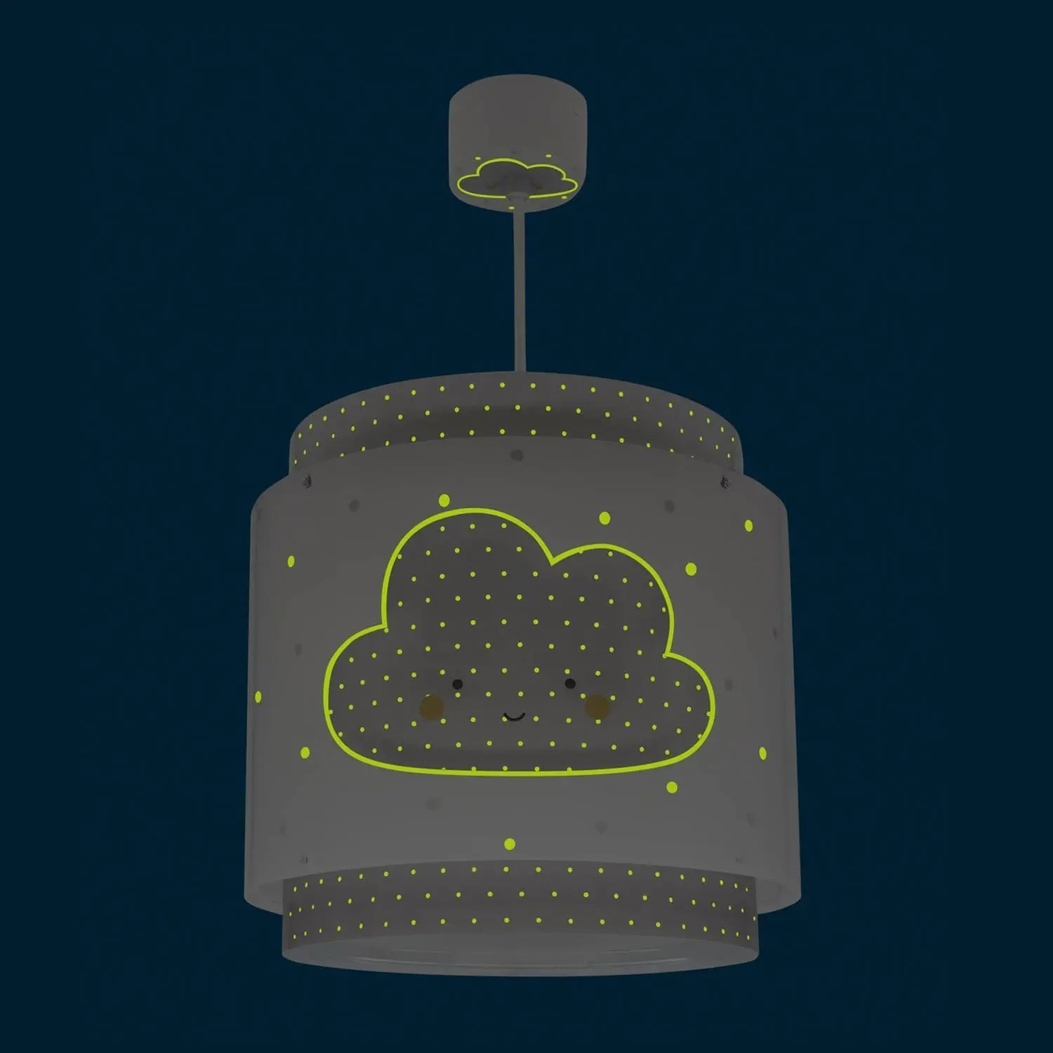 - Estilo: Infantil, diseño de nubes grises con efecto fluorescente.