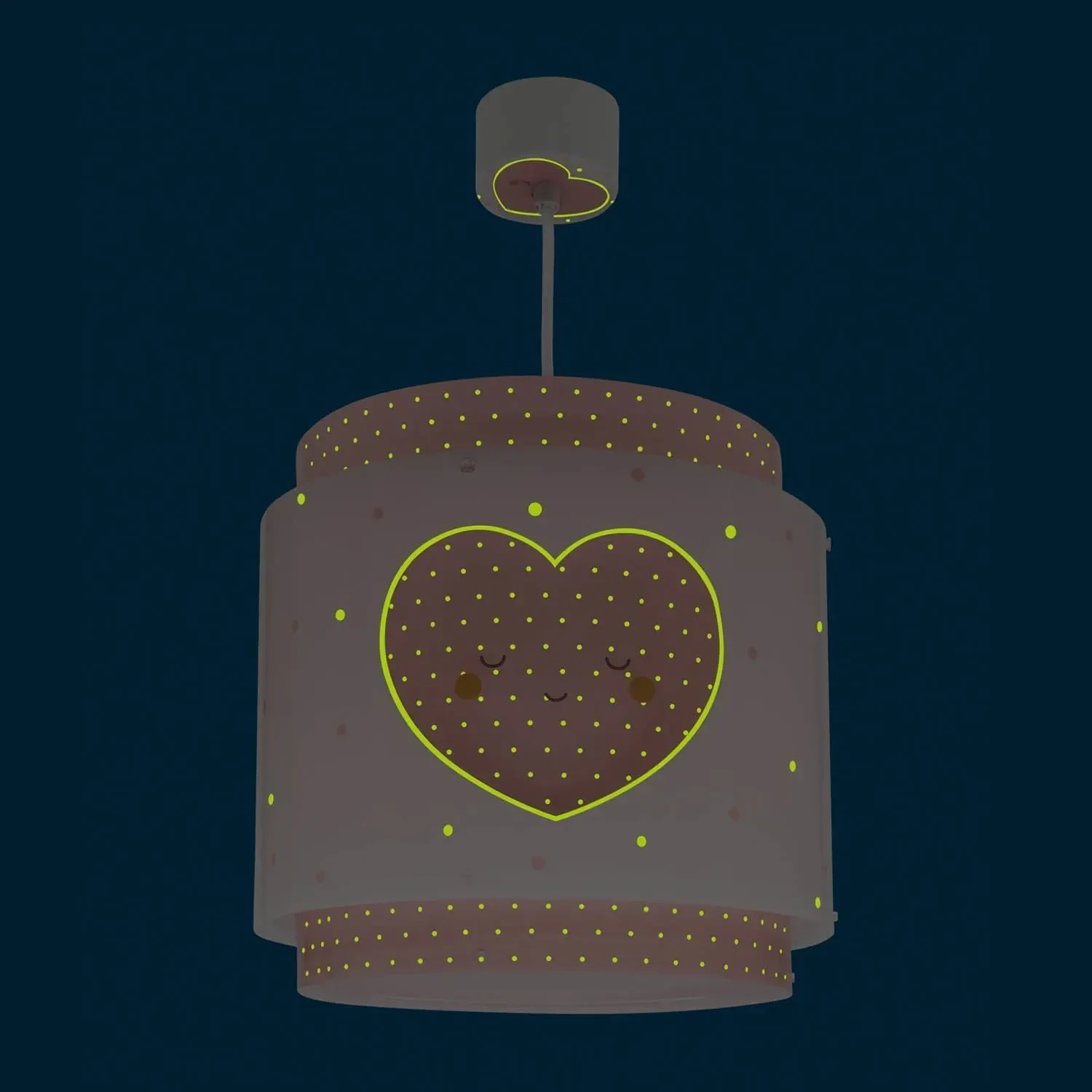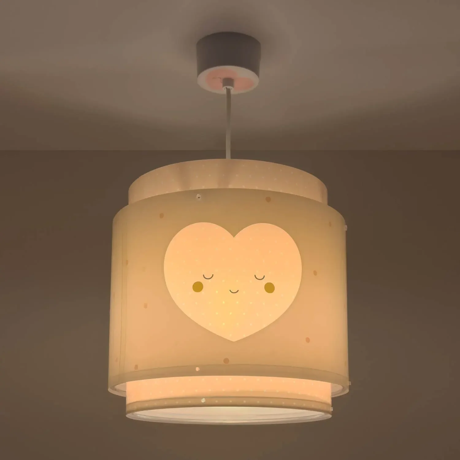 Esta lámpara de techo cuenta con un diseño adorable de tres corazones en color rosa que brillan en la oscuridad, creando un ambiente suave y reconfortante. Fabricada en polipropileno, es ligera y segura, perfecta para habitaciones infantiles. La lámpara mide 65 cm de alto (incluyendo la pantalla) y tiene un diámetro de pantalla de 26 cm, lo cual la hace ideal para iluminar toda la estancia.