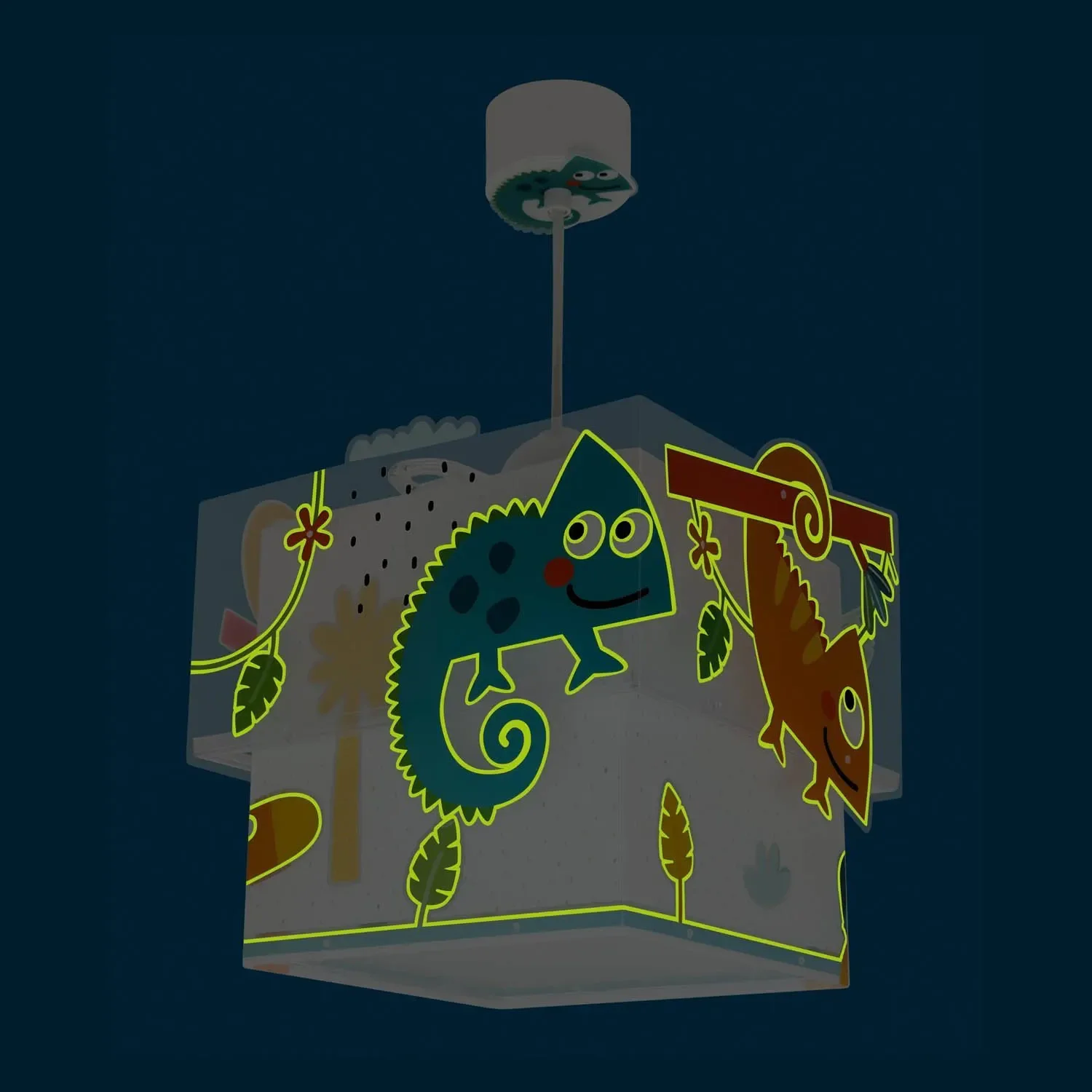 Esta divertida lámpara de techo infantil cuenta con un diseño lleno de vida, que muestra un simpático camaleón y una variedad de animales de la jungla, no solo proporciona luz, sino que también enriquece el entorno de los niños. Su capacidad para brillar en la oscuridad es una característica fundamental, ya que crea un ambiente acogedor y seguro para que los pequeños se sientan tranquilos al dormir.