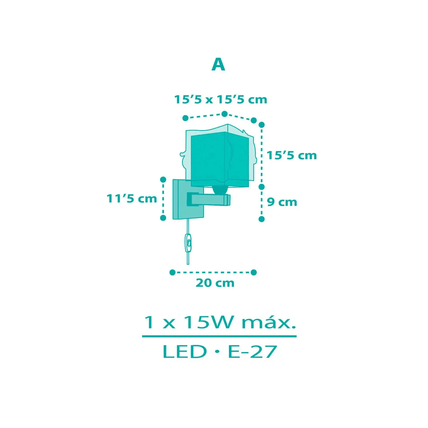 El aplique se adapta a diferentes tipos de instalación, ya sea con cable o sin él, y viene con un interruptor para mayor comodidad. Funciona con una bombilla LED E27 (no incluida), lo que lo convierte en una opción económica y de bajo consumo. Con un diseño seguro, práctico y duradero, fabricado en materiales de calidad, este aplique es ideal para decorar y proporcionar luz en cualquier habitación infantil.