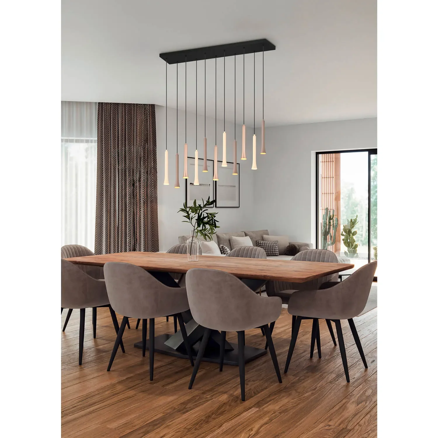 La lámpara está fabricada en metal en tres colores: negro, gris pardo y coffee, lo que le permite encajar perfectamente en cualquier estilo decorativo, desde lo más moderno hasta lo más contemporáneo. Su base rectangular de 115 cm de ancho ofrece una distribución uniforme de la luz, ideal para iluminar de manera eficiente espacios amplios como comedores, salones o pasillos. Además, con una altura ajustable de hasta 150 cm, la lámpara se adapta perfectamente a techos de diferentes alturas.