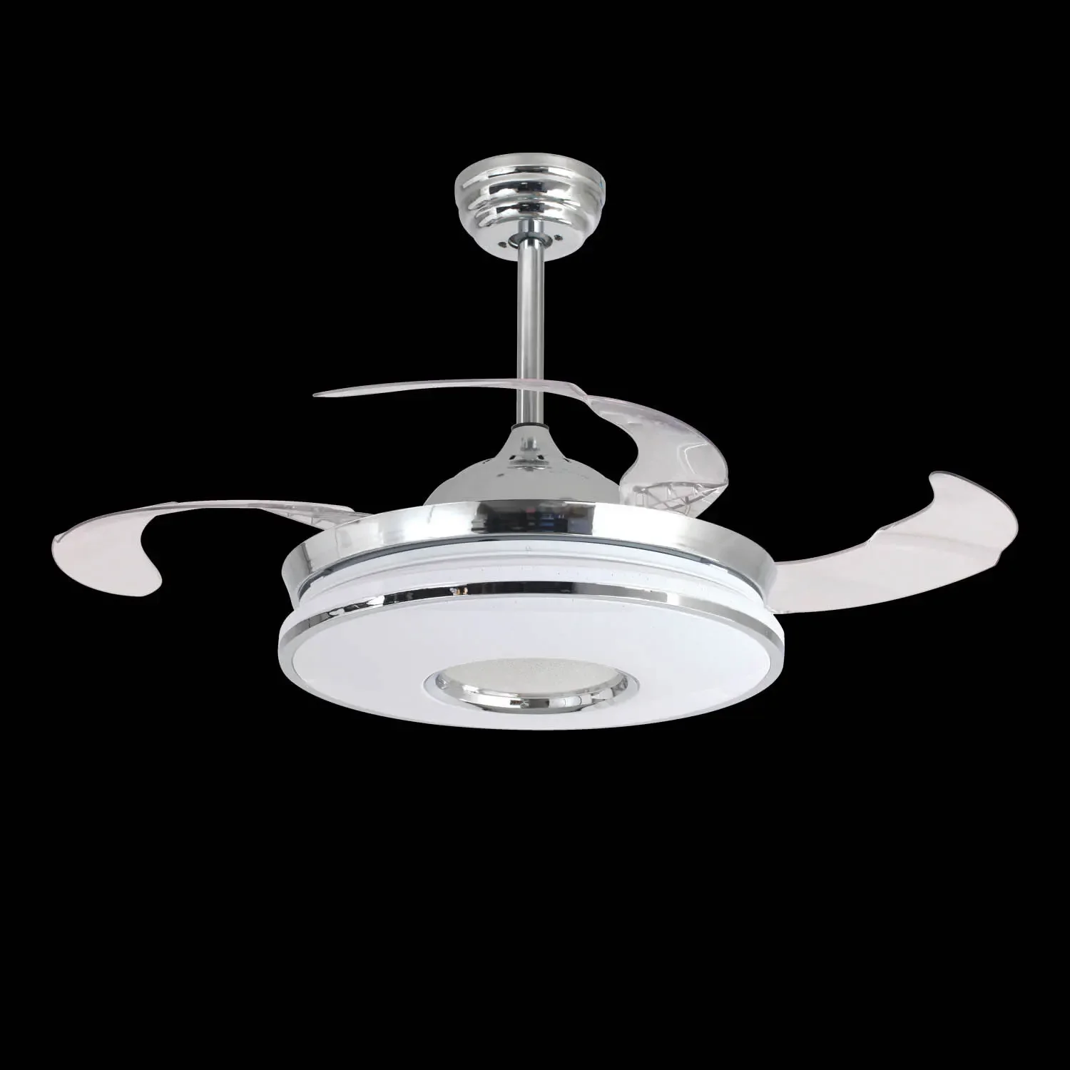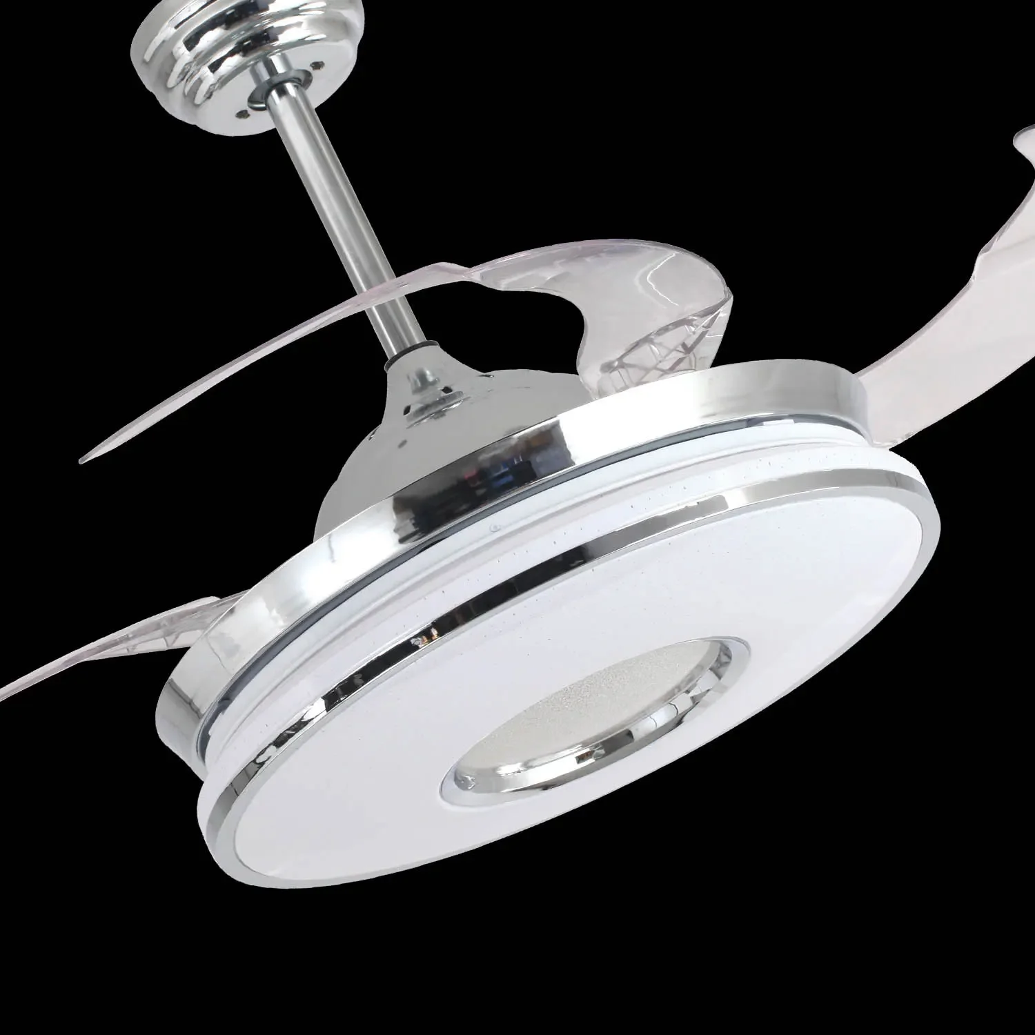 El modelo Wakana es un ventilador de techo elegante y moderno, equipado con tecnología LED de 32W y 4 aspas plegables de policarbonato transparente que se ocultan cuando no están en funcionamiento. Su motor DC garantiza un funcionamiento eficiente, silencioso y con 6 velocidades ajustables.