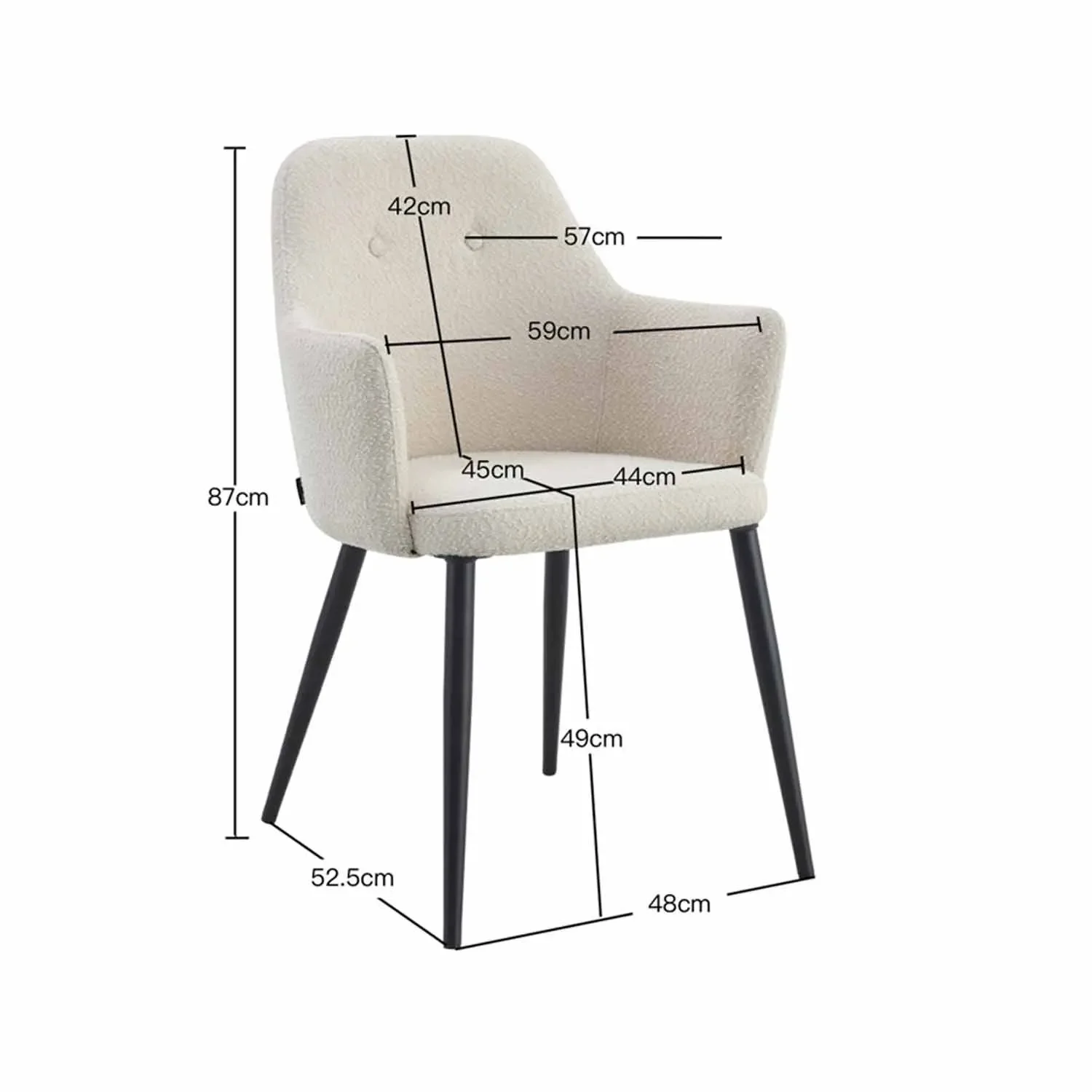 Su comodidad es otro de sus puntos fuertes: el asiento mullido se adapta al cuerpo, mientras que la estructura sólida garantiza durabilidad. El contraste entre el tapizado gris claro y las patas metálicas negras genera un efecto visual equilibrado, convirtiéndolo en un complemento perfecto para comedores, despachos o salones contemporáneos.