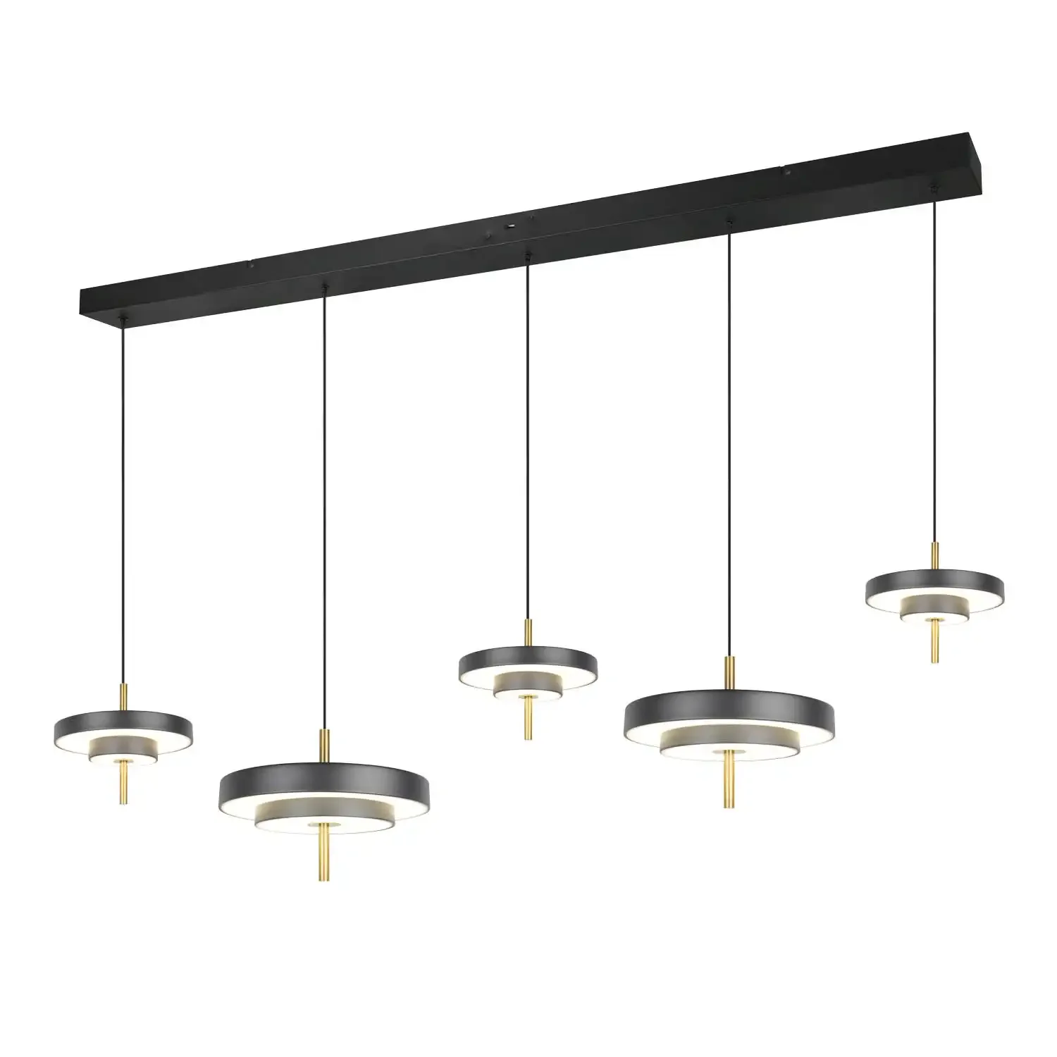 Con una estructura metálica de alta calidad y un elegante acabado en negro y oro, aporta un estilo moderno y distinguido a cualquier espacio interior. Su LED SMD integrado proporciona un flujo luminoso de 5900 lúmenes, ofreciendo una iluminación intensa y uniforme para grandes estancias.