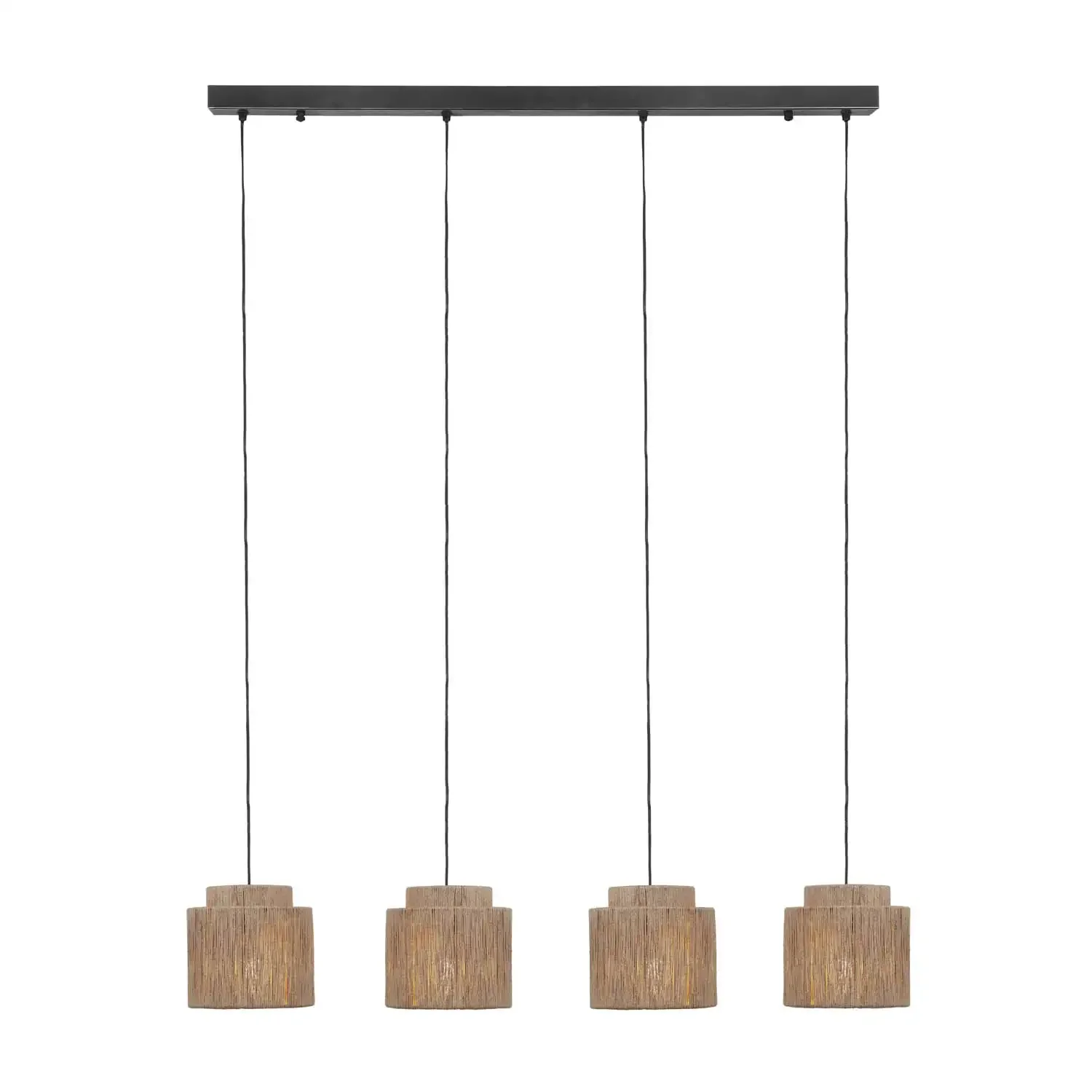 Gracias a sus cuatro puntos de luz, esta lámpara proporciona una iluminación uniforme y decorativa, perfecta para comedores, salones o cocinas. Las pantallas de yute filtran la luz con suavidad, generando una atmósfera confortable y natural. Además, su altura ajustable permite adaptarla fácilmente al espacio, garantizando funcionalidad y estilo.