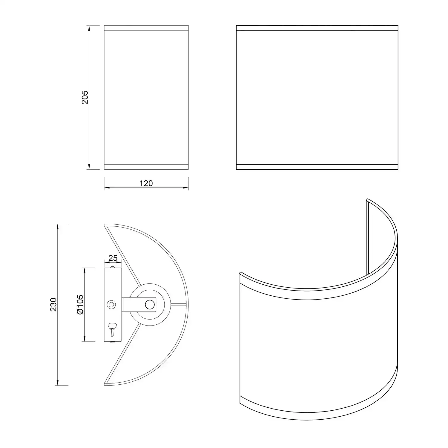 Su estructura metálica en color estera negra contrasta con la calidez de la pantalla, creando una combinación moderna y equilibrada. Puede instalarse directamente a la pared y cuenta con interruptor integrado, lo que facilita su uso en dormitorios, salones o pasillos.