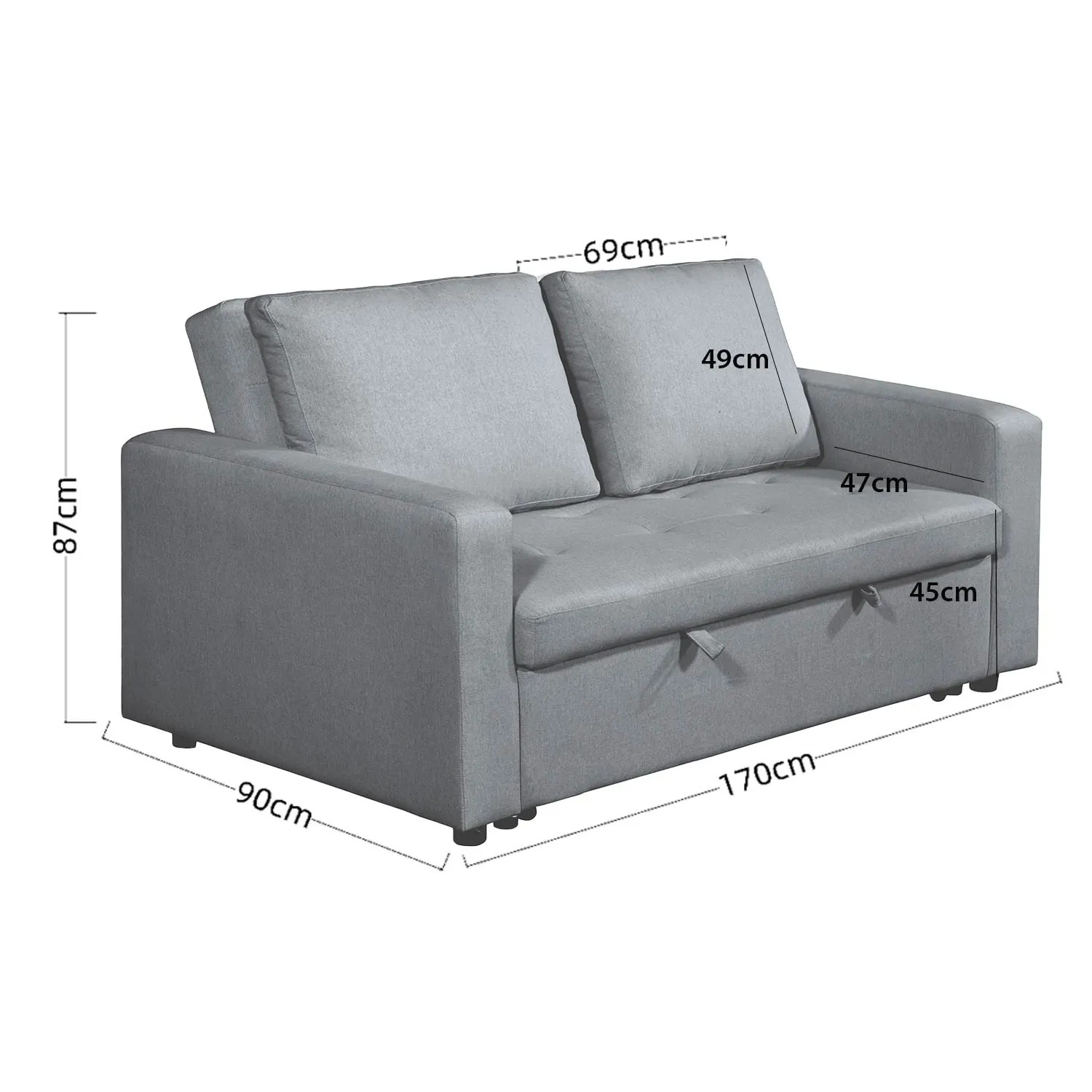 - Dimensiones versátiles: sofá 170x90x89 cm, cama 142x185x45 cm.