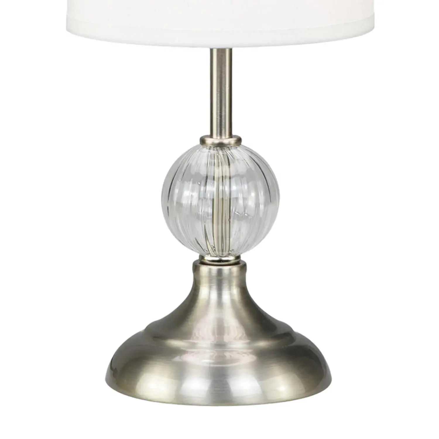 ¡Añade un toque de estilo y luz cálida a tus espacios con la lámpara de mesa Mirabella en níquel satinado y transforma cualquier rincón!