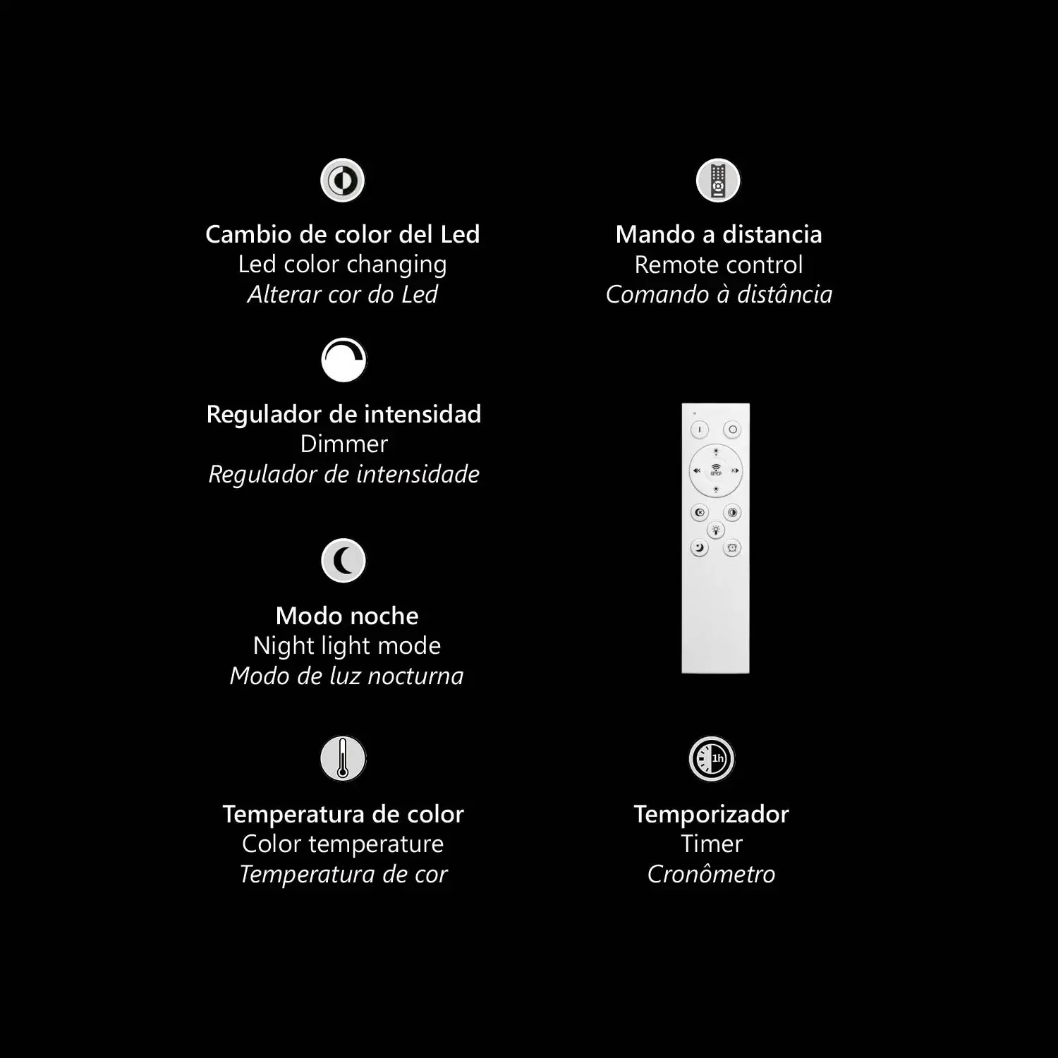 - Funciones adicionales: Regulador de intensidad, cambio de color, temporizador, modo noche