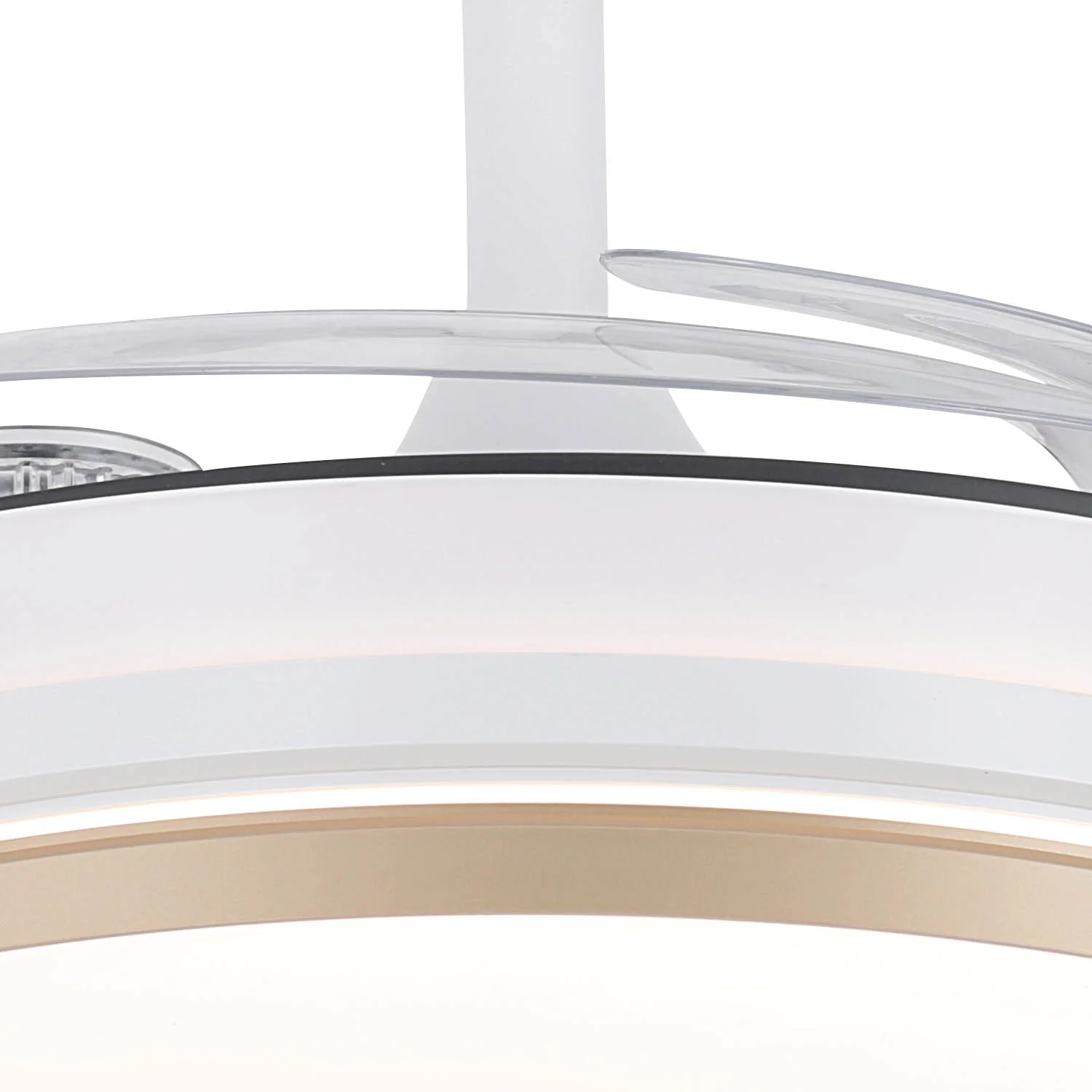El Ventilador De Techo Led 40W Regulable Aspas Retráctiles Aurelio destaca por su diseño refinado, donde el blanco se fusiona con elegantes detalles en dorado en el difusor acrílico, convirtiéndolo en una pieza decorativa ideal para salones, dormitorios y estancias modernas. Sus 4 aspas plegables de PC transparente se despliegan únicamente cuando el ventilador está en funcionamiento, manteniendo una estética limpia cuando permanece apagado.